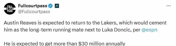 据ESPN多名记者联合报道,Bobby Marks、Dave McMenamin等表示:“一位湖人的匿名高管透露,里夫斯会拿超过3000万的年薪,并且大概率会继续留在湖人,长期和东契奇搭配,此前东契奇身边担任这个角色的是布伦森和欧文。事实证明,东契奇身边也需要这样一个后卫搭档,下一个这样的球员就是里夫斯。”