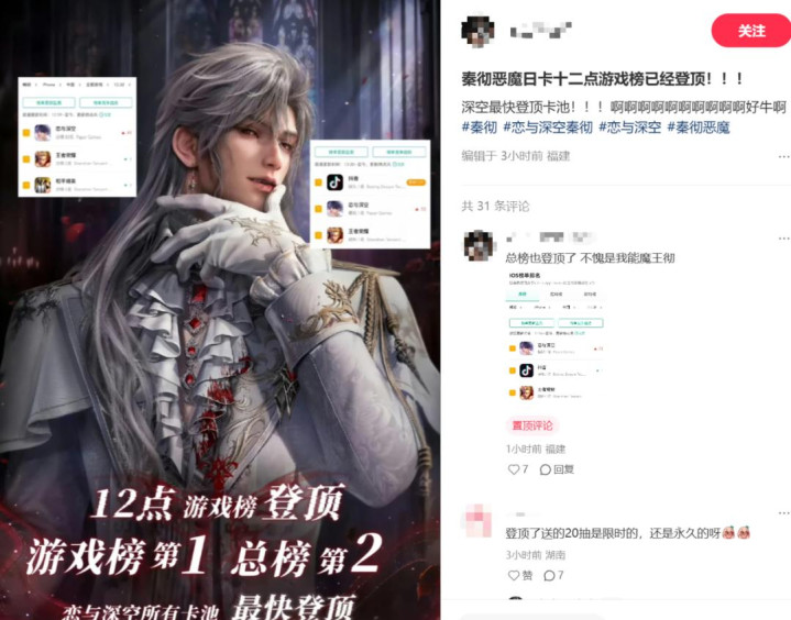 值得一提的是,在去年秦彻日卡首曝之时,《恋与深空》也是迅速登顶国内App Store畅销榜首。自从去年9月底首次登顶iOS畅销榜总榜以来,这是它第7次拿下该成绩。