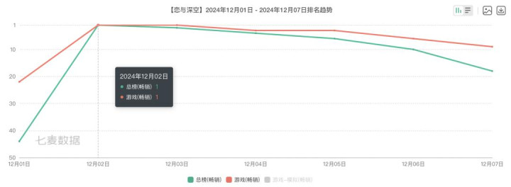 午休一觉醒来,今日(12月2日)国内iOS商店畅销榜首就换人了。中午12点,刚刚更新完开服的《恋与深空》排名突然在游戏畅销榜飙升到了榜首,到下午4点左右更是直接冲到畅销总榜第一。
