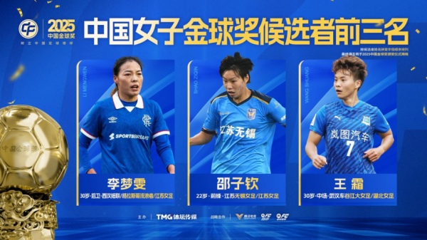 中国女子金球奖评选的前三名包括延续旅欧生涯的李梦雯、强势成为国家队年度最佳射手的邵子钦,以及在多线赛场率领武汉车谷江大创造佳绩的王霜。李梦雯在上一届评奖中就跻身前三,持续以闯荡欧洲推进职业生涯。而在国家队赛场不断破门并助力江苏队夺得全运会金牌的邵子钦,则是第一次从候选名单脱颖而出。作为中国女子金球奖历史上获奖次数最多的球员,王霜在2025年奉上诸多名场面,帮助武汉车谷江大登上亚洲之巅,强势回榜绝对实至名归。长春大众卓越女足队长刘靖入围参评球员。