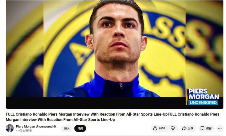 直播吧11月08日讯C罗接受摩根采访第三部分在Channel5直播,没有C罗采访的新内容。而摩根youtube频道也更新,标题为完整版采访内容,时长为2小时18分钟。