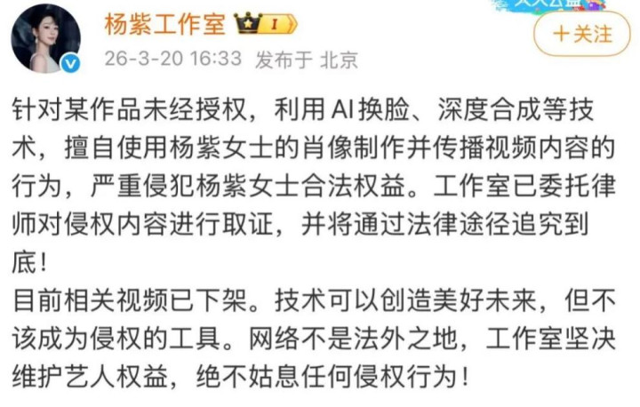 但艺人们要面临的“困境”可不仅仅是这些圈内的“竞争”,还有外界科技带来的冲击,就连杨紫都亲自发文维权。